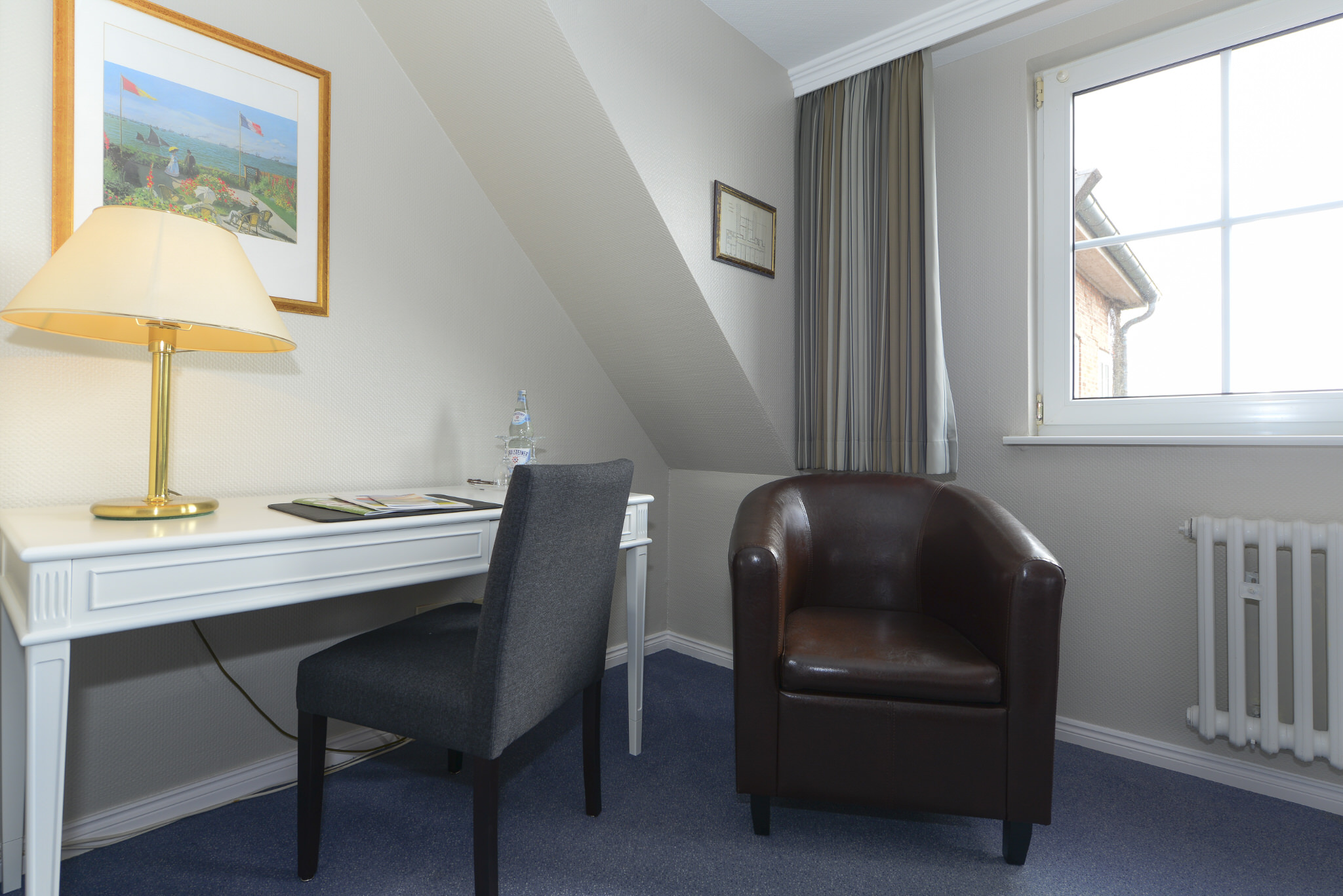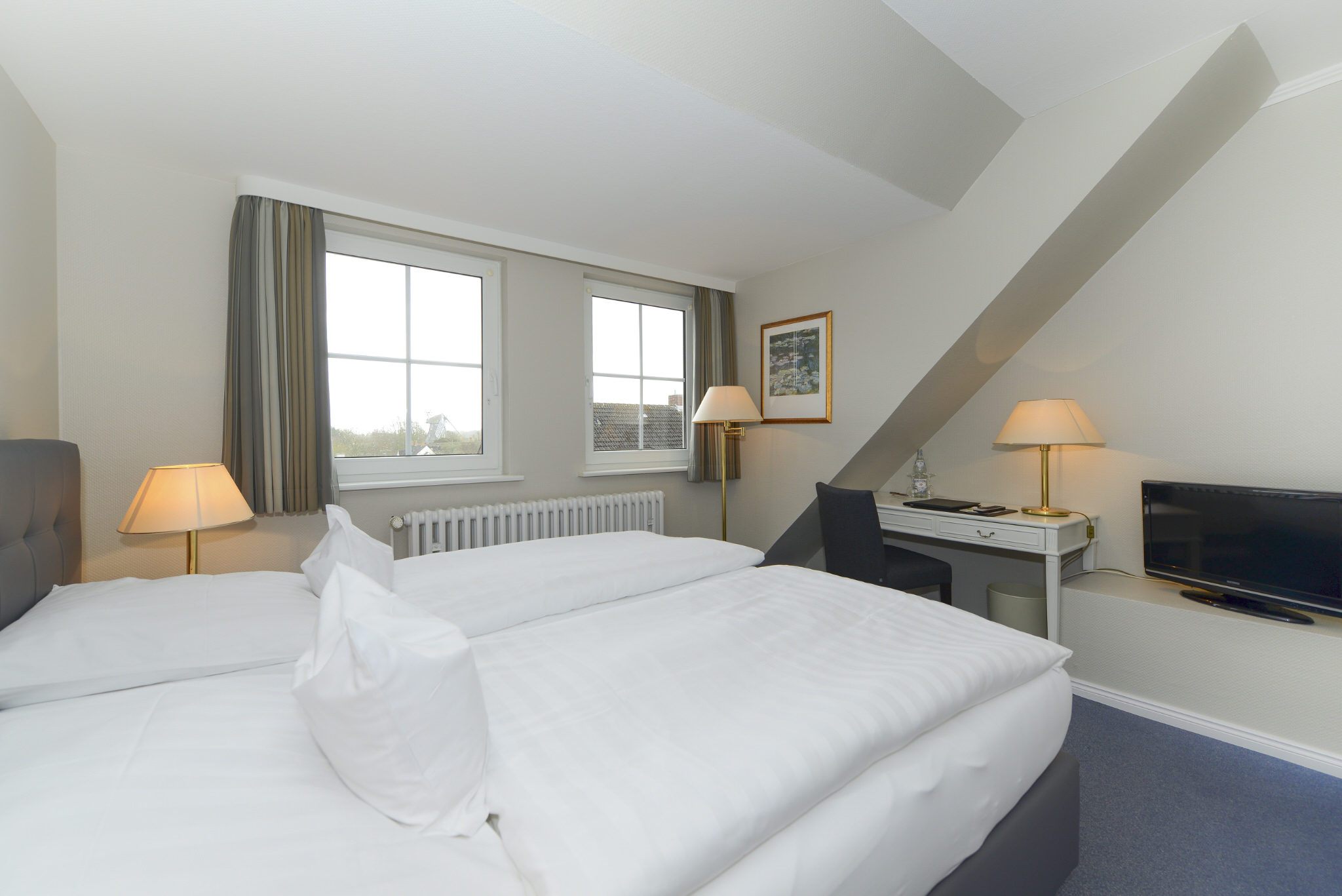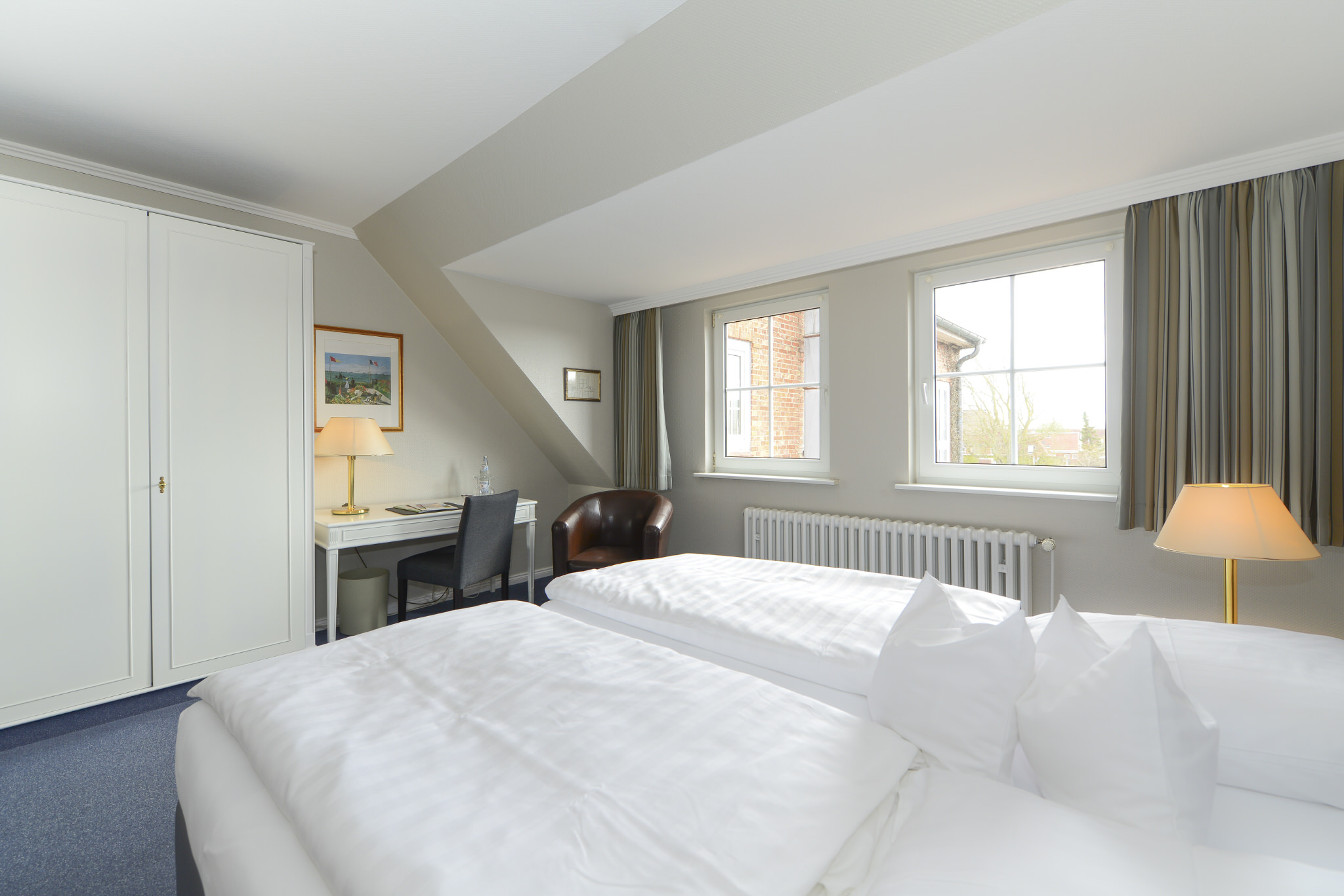 Die sechs Zimmer, teilweise mit Blick auf die historische Mühle, liegen im hinteren Teil des Hotels. Nahezu alle der zwischen 20 und 30 qm großen Zimmer sind mit Teppichboden, Schreibtisch, Sitzmöglichkeiten und Boxspringbetten ausgestattet.